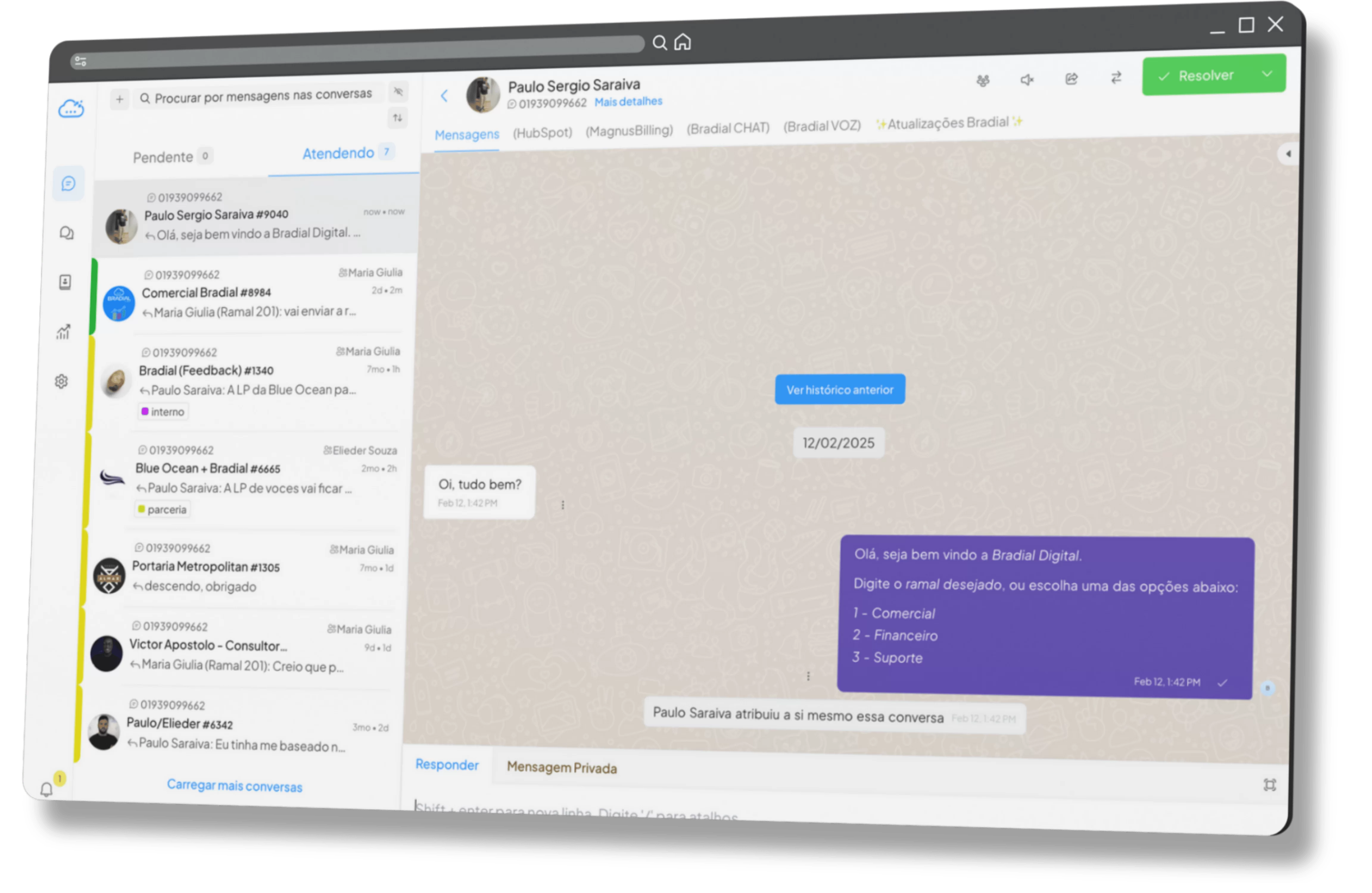 Simples como o WhatsApp Web, sua equipe não terá dificuldade alguma para usá-la, além das vantagens de poder transferir um atendimento, finalizá-lo ou até mesmo deixar agendado para outro momento